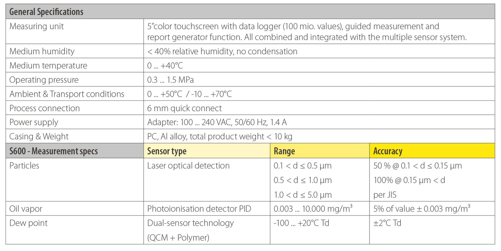 ISO 8573 compliant purity quantifications of compressed air systems are bound to time-consuming installations and long-lasting test runs … It’s time for a revolution: The S600 is unlike its competition. It combines the latest sensor technology, software-guided measurements and a time-saving setup into a handy, touchscreen controlled multi-tool. With our S600 you will finish measurement runs in much less time than with your traditional method, after that you don’t ever want to leave your new comfort zone again. Trust us.