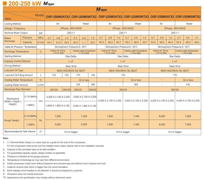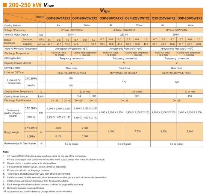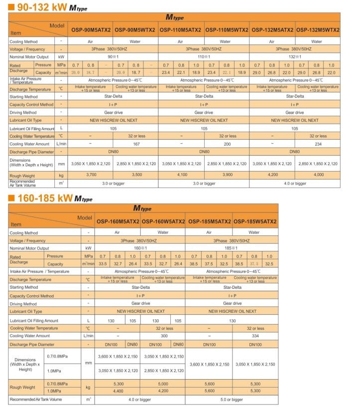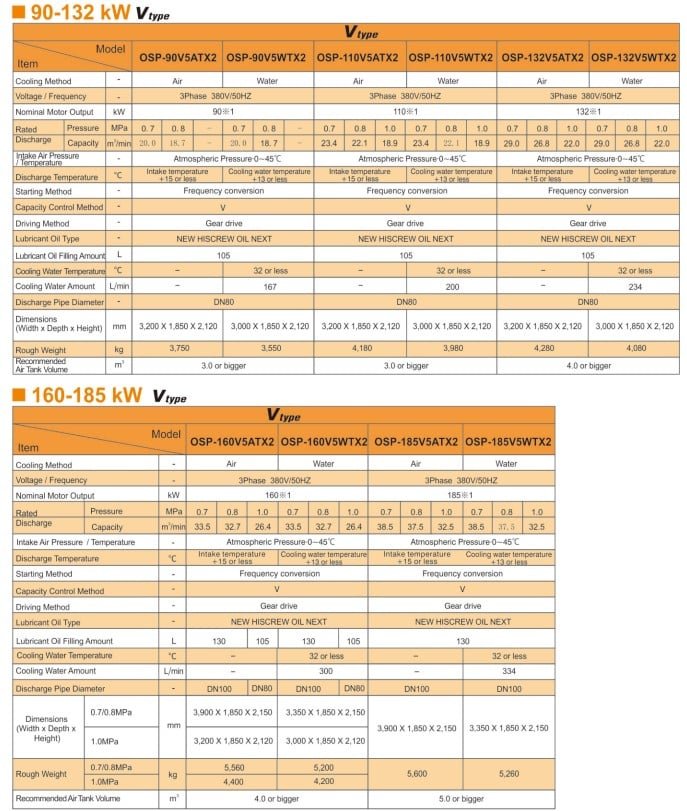 Hitachi OSP Oil-Flooded Screw NX2 Series two-stage compressor is the latest interpretation of Hitachi air compressor’s energy-saving technology. Compared to single-stage compressors, two-stage compressors achieve higher efficiency and energy saving by minimizing leakage between rotors and reducing the load on the second stage air end. This series is available as variable speed (V type) or fixed speed (M type), with output ranging from 90 to 250 kW.