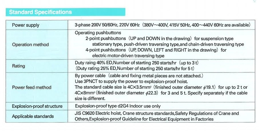 - The explosion-proof ability of the hois/crane saddle is determined by the stipulations of either the “Explosion-proof Guideline for Electrical Equipment in Factories” or “Explosion-proof Standard for Gases and Vapor” though the conditions vary by the ignition group and explosion class of the using gas and the place of it’s existence. Not only the motor, but the brake and terminal box are all given the explosion-proof treatment.